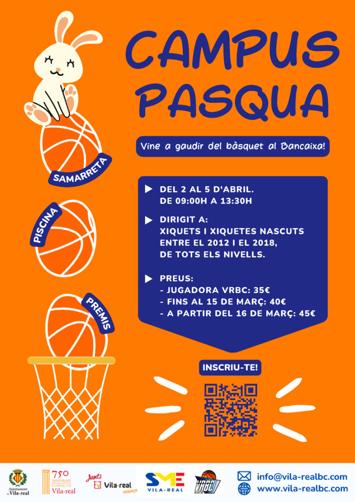 Des del Vila-real BC volem oferir-vos un programa complet de sessions tecnicotàctiques individuals, col·lectives i jocs esportius totalment dirigits pels nostres entrenadors/es, on durant aquests dies festius faran gaudir del bàsquet a tots el xiquets i xiquetes al Campus de Bàsquet de Pasqua al Pavelló Bancaixa.